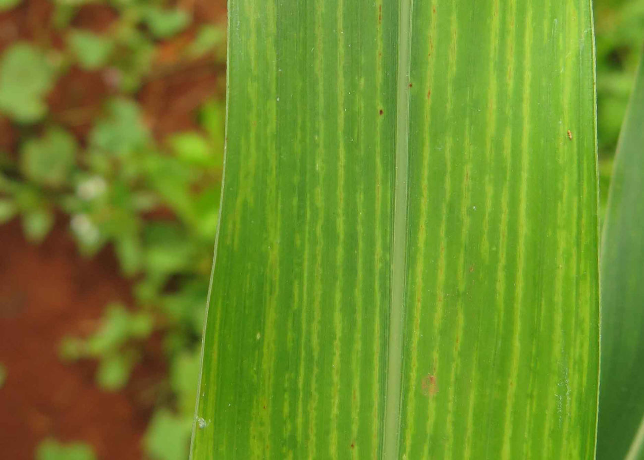 Entre as viroses que afetam o sorgo, destaca-se o mosaico-comum, causado por potyvírus, que provoca redução na produção de grãos e forragem. Os sintomas da planta infectada podem ser expressos como mosaico típico ou necrose foliar, dependendo da cultivar atacada. No primeiro, as folhas têm áreas cloróticas entremeadas com áreas verdes (figura 2) e, no segundo, áreas necrosadas de cor avermelhada ou amarelada (figura 3).