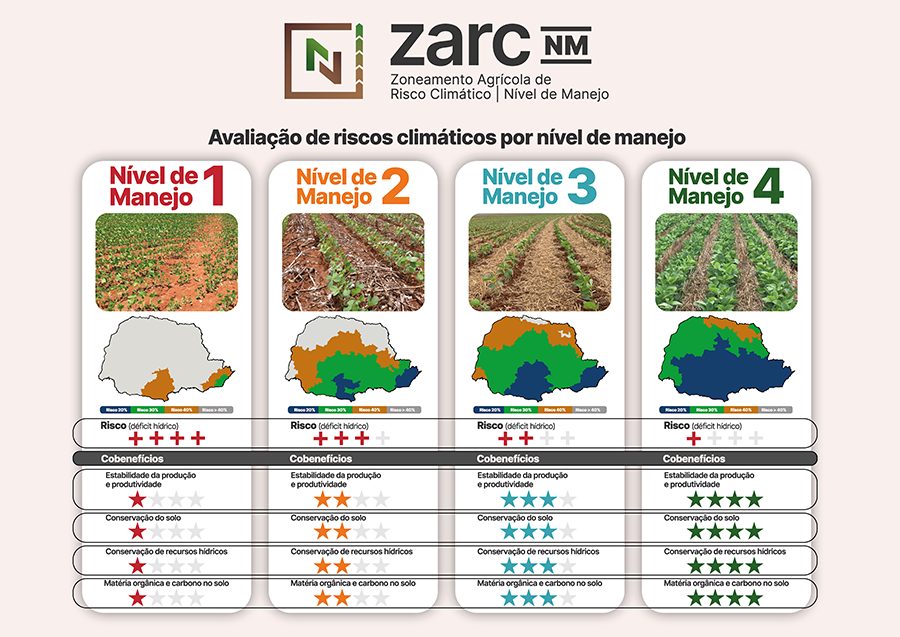 Com base em avaliações de campo conduzidas pela Embrapa em 62 propriedades do Paraná e 201 locais do Mato Grosso do Sul, foi possível validar a metodologia de classificação. Farias explica que o segundo nível do ZarcNM, o NM2, representa a média dos manejos de solo até então adotados nesses estados.