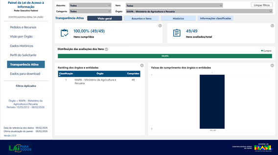 O Ministério da Agricultura e Pecuária (Mapa) alcançou 100% de cumprimento dos itens de transparência ativa na avaliação realizada pela Controladoria-Geral da União (CGU). O resultado consta do Painel da Lei de Acesso à Informação e posiciona o Ministério entre os órgãos federais com desempenho máximo no cumprimento das obrigações previstas na Lei de Acesso à Informação (Lei nº 12.527/2011).