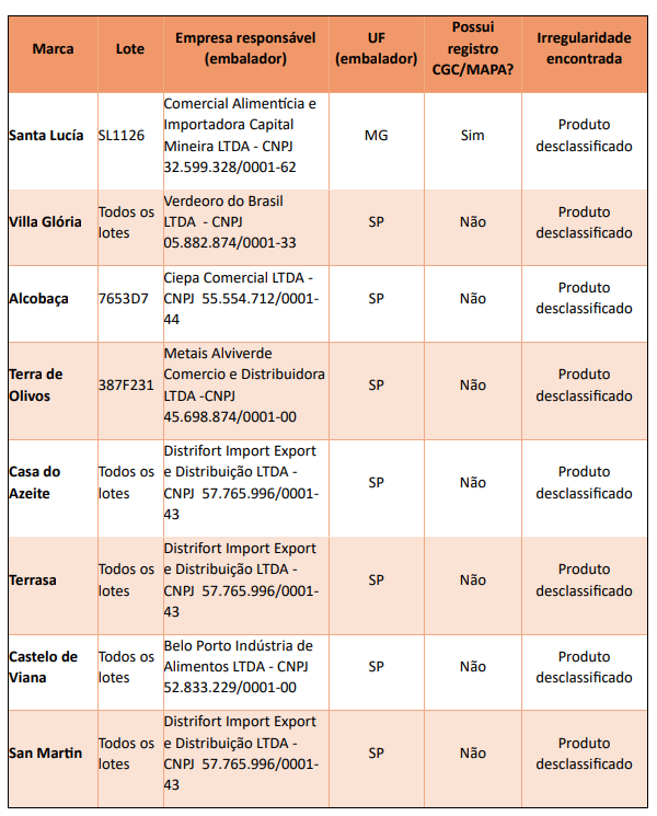 O Ministério da Agricultura e Pecuária (Mapa), por meio da Secretaria de Defesa Agropecuária (SDA), divulgou um alerta de risco ao consumidor relacionado à comercialização de oito marcas de azeite de oliva consideradas desclassificadas por fraude. As ações de fiscalização foram conduzidas pelo Departamento de Inspeção de Produtos de Origem Vegetal (DIPOV), em parte com o apoio da Polícia Civil do Espírito Santo e da Polícia Civil de São Paulo.
