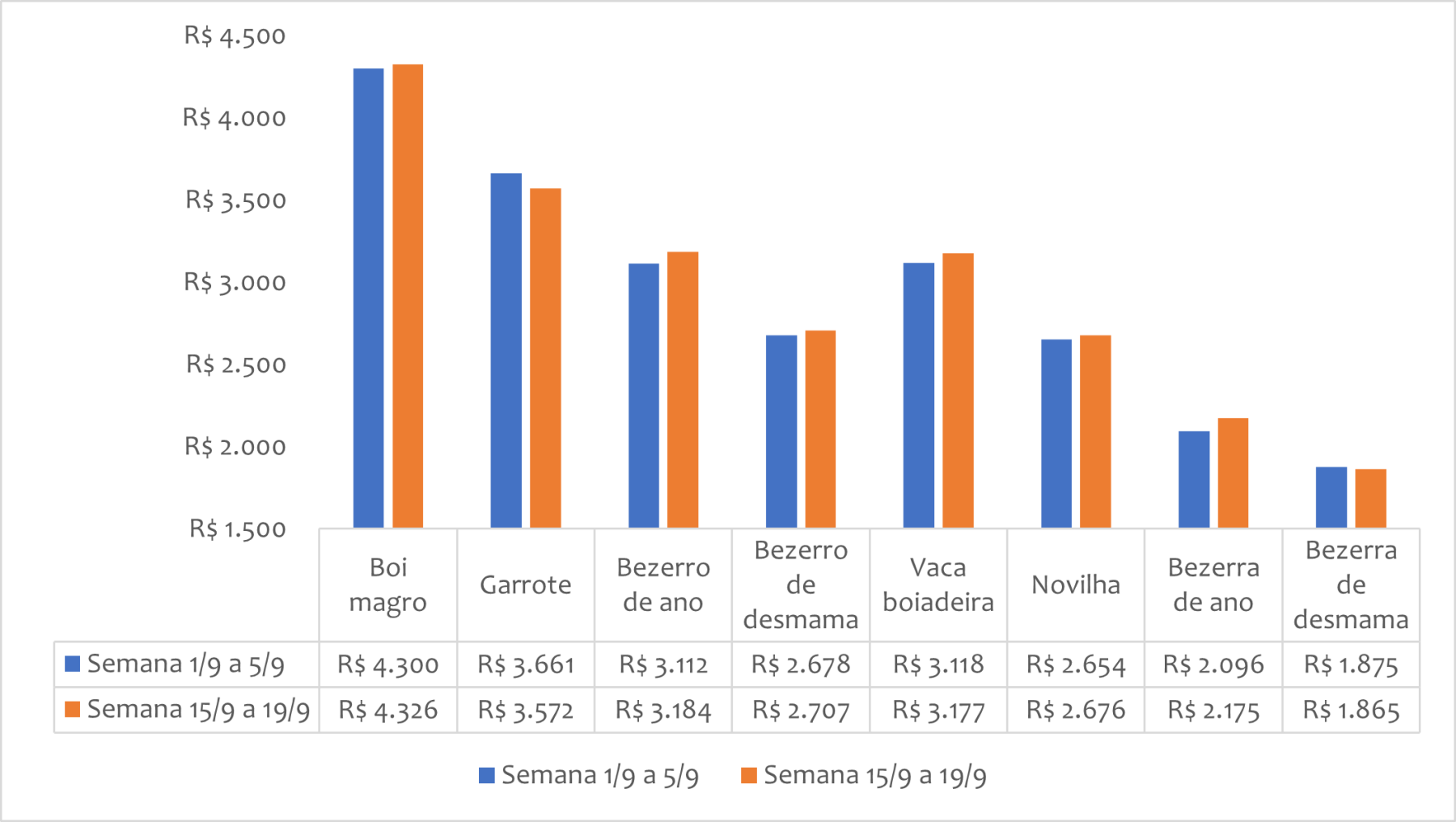 Cotação média (R$/cabeça) na primeira e na terceira semana de setembro para a reposição de bovinos anelorados, em Mato Grosso.