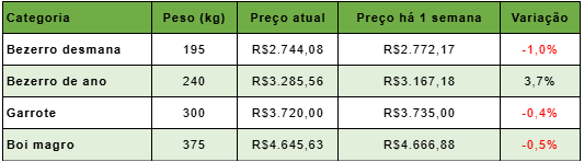 Na comparação das cotações dos machos anelorados, feita semana a semana em Mato Grosso do Sul, a cotação do bezerro de desmama caiu 1,0%, a do garrote 0,4% e a do boi magro 0,5%. Apenas a cotação do bezerro de ano subiu no período (tabela 1).