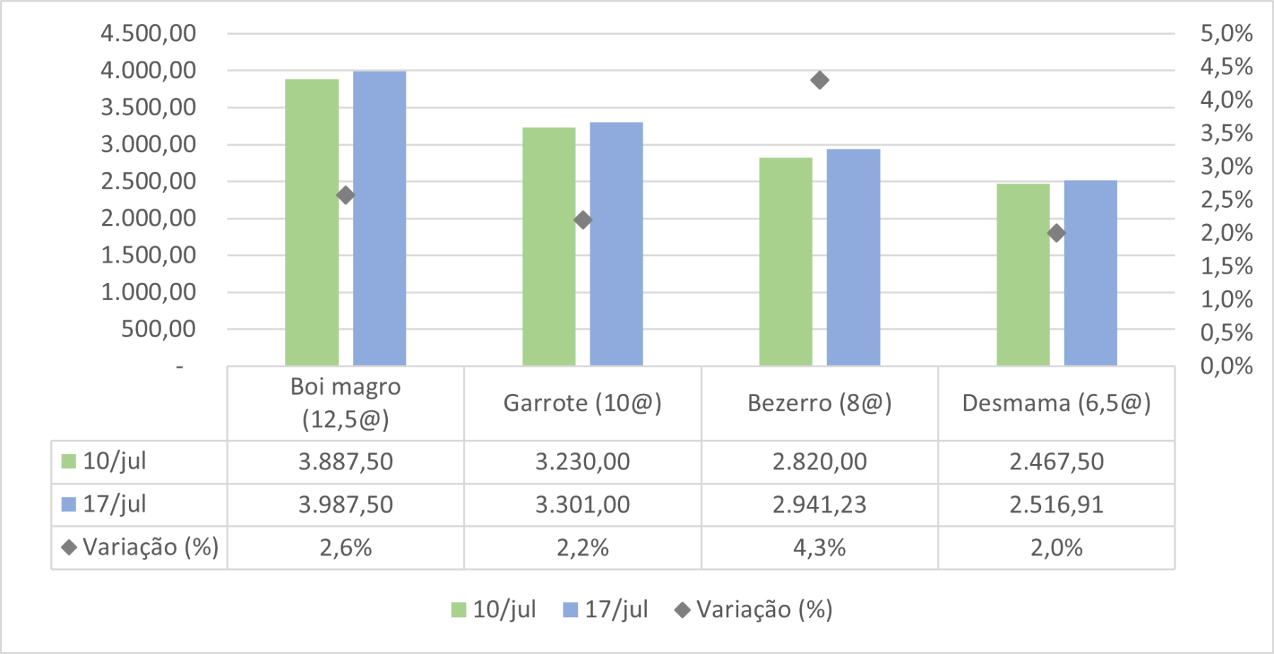 Na comparação feita semana a semana, a cotação dos machos destinados à reposição subiu. A cotação do boi magro (12,2@) subiu 2,6%, a do garrote (10@) 2,2%, a do bezerro de ano (8@) 4,3%, e a do bezerro de desmama (6,5@) 2,0% (figura 2).