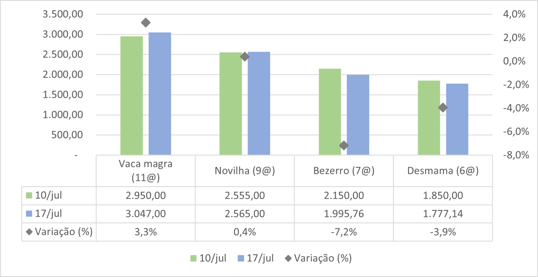 Entre as fêmeas, a cotação das categorias mais leves caiu. A cotação da bezerra de ano (7@) caiu 7,2% e a da desmama (6@) caiu 3,9%. Para as categorias mais eradas a cotação subiu. A cotação da vaca magra (11@) subiu 3,3% e a da novilha (9@) subiu 0,4% (figura 3).