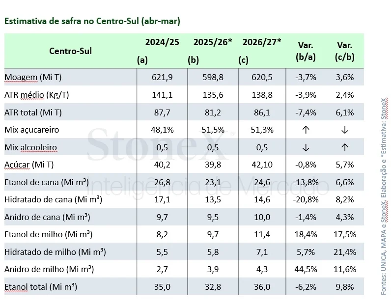 A primeira estimativa para a safra 2026/27 de cana-de-açúcar no Centro-Sul projeta moagem de 620,5 milhões de toneladas, alta de 3,6% em relação ao ciclo 2025/26. O resultado colocaria a região diante da terceira maior safra já registrada, de acordo com dados da StoneX, empresa global de serviços financeiros.