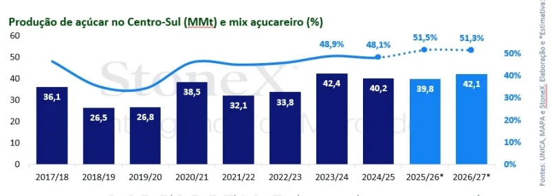 “A recuperação das áreas reformadas após as queimadas e o retorno esperado das chuvas criam um ambiente mais favorável para o setor. Esses fatores, somados ao rejuvenescimento do canavial, explicam a projeção de uma safra entre as maiores da história do Centro-Sul”, destaca o analista de Inteligência de Mercado da StoneX, Marcelo Di Bonifácio Filho.