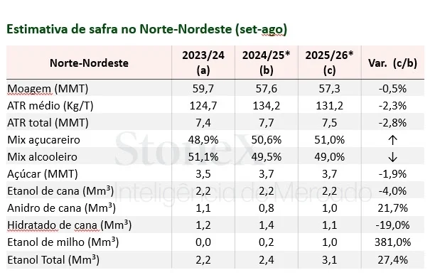 No Norte-Nordeste, a moagem de cana em 2025/26 deve se manter praticamente estável, em 57,3 milhões de toneladas, leve queda de 0,5% sobre o ciclo anterior. A produção de açúcar, no entanto, tende a recuar 1,9%, para 3,65 milhões de toneladas, refletindo a normalização do ATR após resultados recordes em 2024/25.