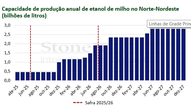O grande destaque da região está no etanol de milho, cuja produção deve se aproximar de 1 bilhão de litros já em 2025/26, com 962 mil m³. O avanço é impulsionado pela entrada em operação de novas plantas, como a usina da Inpasa em Luís Eduardo Magalhães (BA), com capacidade superior a 500 mil m³ anuais, além de mais uma iniciativa na Bahia e projetos em Tocantins, Piauí e Rondônia.