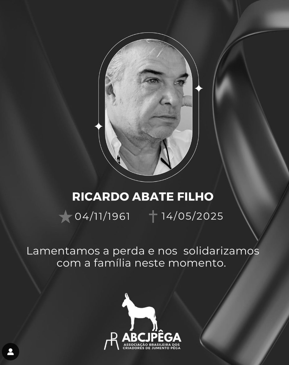 “É com profundo pesar que lamentamos a perda de Ricardo Abate Filho, criador da raça Pêga e referência no meio da equinocultura. Seu legado, dedicação e paixão deixarão marcas eternas na história da criação nacional, se eternizando a linhagem RAF na Família ABATE. Neste momento de dor, nos solidarizamos com toda a família e amigos, pedindo a Deus que conforte seus corações e dê forças para superar essa imensa perda.”