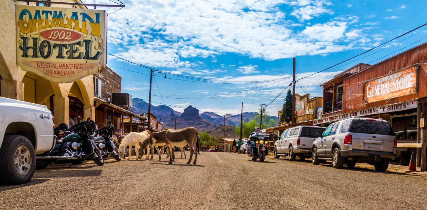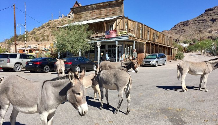 Antiga cidade mineira no deserto do Arizona, Oatman é hoje um dos pontos mais curiosos da histórica Rota 66, onde burros descendentes dos tempos da corrida do ouro vivem livremente, interagem com turistas.