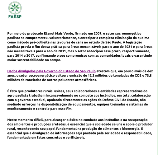 No documento, o presidente da Faesp, Tirso Meirelles, reitera a necessidade da divulgação de informações verídicas sobre o assunto, assim como solidariedade por parte da população e das autoridades.