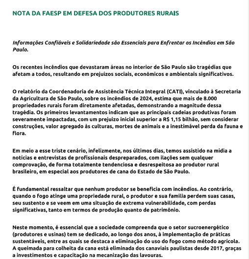 A Federação da Agricultura e Pecuária do Estado de São Paulo (Faesp) emitiu na tarde desta terça-feira (24) uma nota sobre relatório da Coordenadoria de Assistência Técnica Integral (CATI), da Secretaria da Agricultura e Abastecimento do Estado de São Paulo (SAA), que aponta prejuízos de mais de R$ 1,1 bilhão a mais de 8 mil propriedades rurais afetadas pelos incêndios.