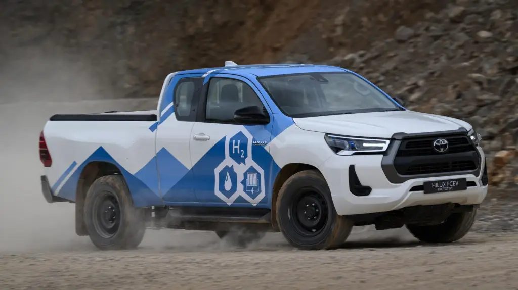 No entanto, a Toyota não pretende parar apenas nos modelos elétricos. O projeto de uma Hilux movida a hidrogênio já está em andamento no Reino Unido, onde dez protótipos foram construídos. Cinco desses veículos estão em testes de campo rigorosos, enquanto os outros cinco são usados em eventos públicos. Esse sistema utiliza a tecnologia de propulsão do Toyota Mirai, o primeiro modelo movido a hidrogênio produzido em série do mundo.