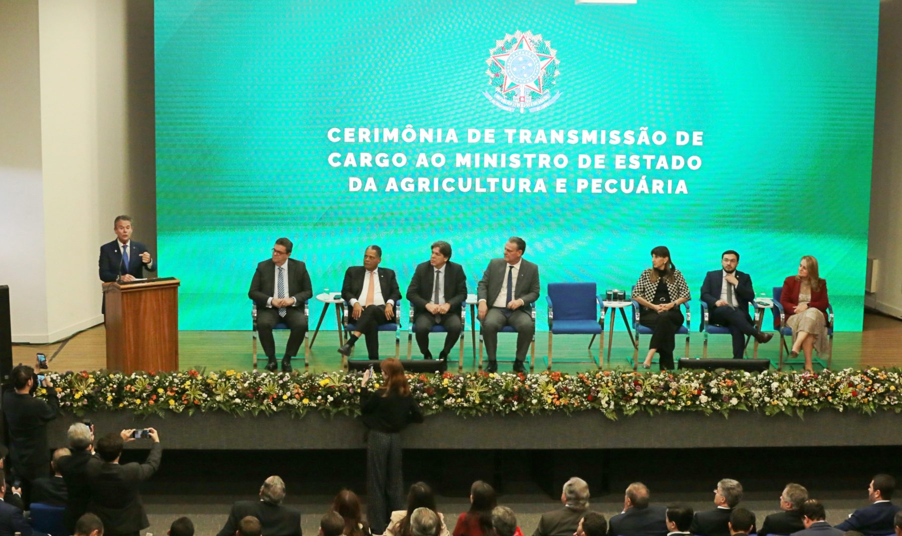 Durante sua fala, o novo ministro da Agricultura e Pecuária, André de Paula, destacou as prioridades para sua gestão. “Assumo o ministério com o compromisso de continuidade das políticas públicas, da governança e da visão estratégica que estruturam o setor e garantem previsibilidade e confiança no Brasil. Seguiremos fortalecendo segmentos como o Plano Safra, o PGPM, o Funcafé e o Seguro Rural. Estaremos atentos às transformações tecnológicas que moldam o presente e o futuro do agro”, disse.