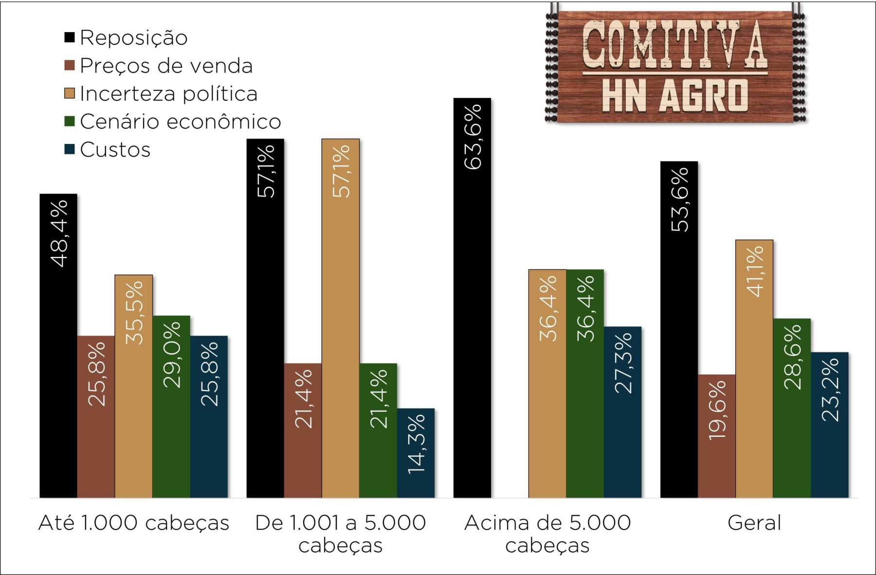 Segundo os dados divulgados por Hyberville Neto, a reposição foi apontada como o maior desafio em todas as faixas de tamanho de rebanho. No consolidado geral, 53,6% dos entrevistados destacaram o item como fator de maior impacto para o próximo ano.