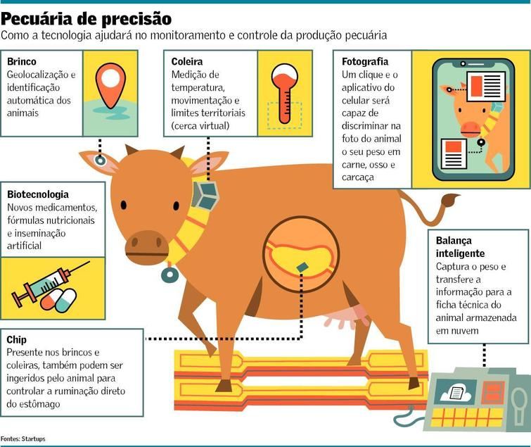 Há em execução atualmente no Brasil dezenas de aplicações diferentes de softwares e hardwares envelopados em coleiras, brincos e balanças inteligentes que geram informações capazes de elevar a produtividade e diminuir o custo de criação de bovinos. Transmitidos em tempo real ou armazenados em nuvem, esses dados começam a fortalecer o recente movimento de digitalização da pecuária, impulsionado pela chegada de startups.