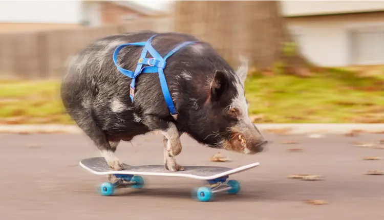 Vincent ajustou os eixos do skate, preparou queijo em palitos e mais amendoins como incentivo, e treinou o animal com paciência. A motivação de Norbert era clara: qualquer petisco valia o esforço. O resultado foi uma performance perfeita — o porco deslizou suavemente até o outro lado da pista, onde Vincent o aguardava com mais guloseimas.