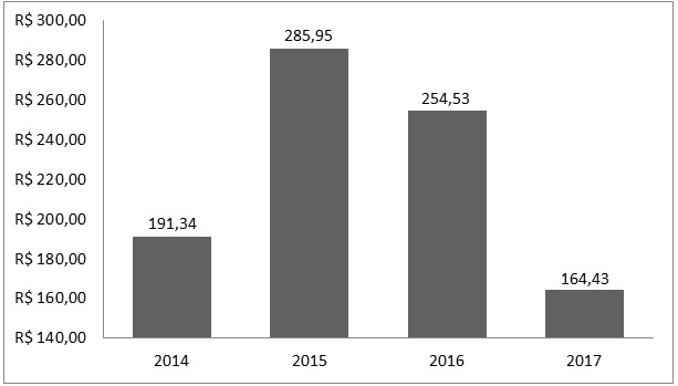 Figura 1. Preço médio do arame liso deflacionado pelo IGP-M (Rolo de 1000 metros) em R$/rolo.