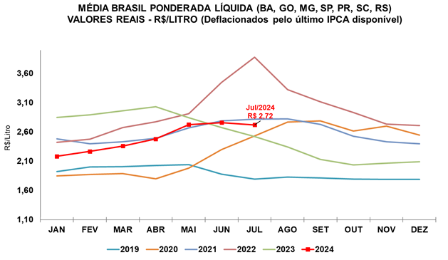 Gráfico 1. Série de preços médios recebidos pelo produtor (líquido), em valores reais (deflacionados pelo IPCA de julho/2024).