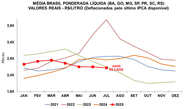 Gráfico 1. Série de preços médios recebidos pelo produtor (líquido), em valores reais (deflacionados pelo IPCA de julho/2025).