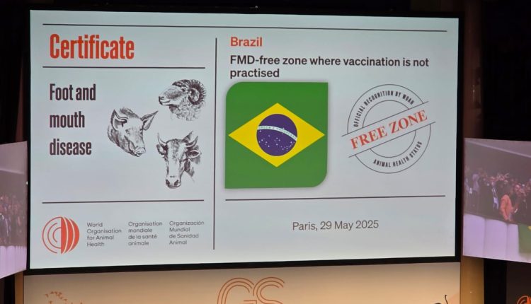 Em um momento histórico para a cadeia agroindustrial da carne bovina, o Brasil obteve hoje o reconhecimento internacional de país livre de febre aftosa sem vacinação. O status sanitário foi aprovado durante a realização da 92ª. Assembleia da Organização Mundial de Saúde Animal (OMSA – ou WOAH na sigla em inglês), que ocorre de 25 a 29 de maio, em Paris, na França.
