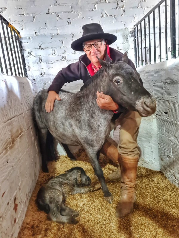 Neste domingo (25/08), um momento de alegria no Pavilhão dos Pôneis – e que chamou muita atenção do público – foi o nascimento do filhote de “Elegância de São Leonardo”, uma fêmea de pelagem tordilha andaluza, de três anos. Collares estava emocionado com o pequeno pônei, que foi o primeiro nascimento registrado na 47ª Expointer.