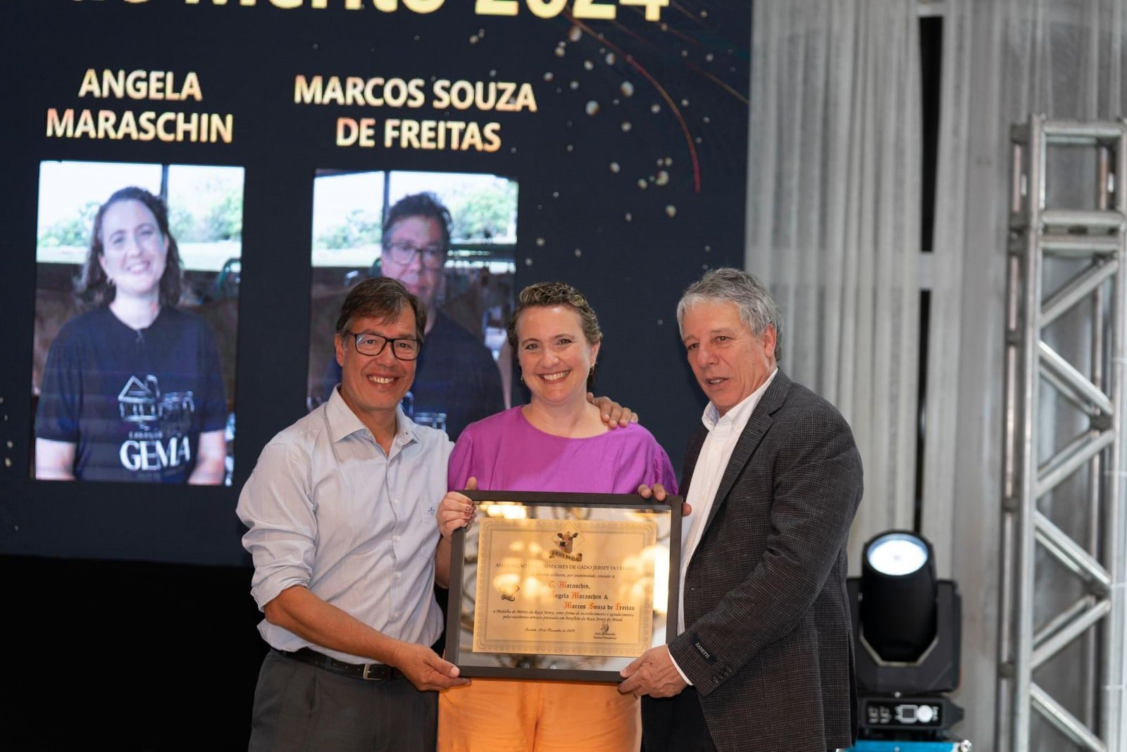 Um dos momentos mais emocionantes da noite foi a entrega da Medalha de Mérito, dedicada às personalidades que marcaram a história e o fomento da raça Jersey. Este ano, o prêmio foi concedido à família Maraschin, da Cabanha Gema, com uma trajetória que começou em 1961 e é referência no Brasil. Representada por Gerzy Ernesto Maraschin, sua filha Ângela Faria Maraschin e o genro Marcos Souza de Freitas, conhecido como Caco, a cabanha combina tradição, excelência e inovação.