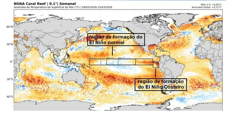 O outono de 2026 começa tecnicamente com o oceano Pacífico Equatorial em modo de neutralidade térmica. Isto significa que não temos a influência de El Niño e nem de La Niña. Porém, um El Niño costeiro já é observado no litoral do Peru e do Equador. As mudanças na circulação de ventos sobre o Brasil, associadas ao El Niño costeiro, ajudam a aumentar a chuva especialmente sobre o Rio Grande do Sul e a prolongar o transporte de umidade da Amazônia em direção ao Centro-Oeste e ao Sudeste do Brasil. Isto vai garantir combustível (ar quente e úmido) para manter as pancadas de chuva por mais tempo nestas regiões.