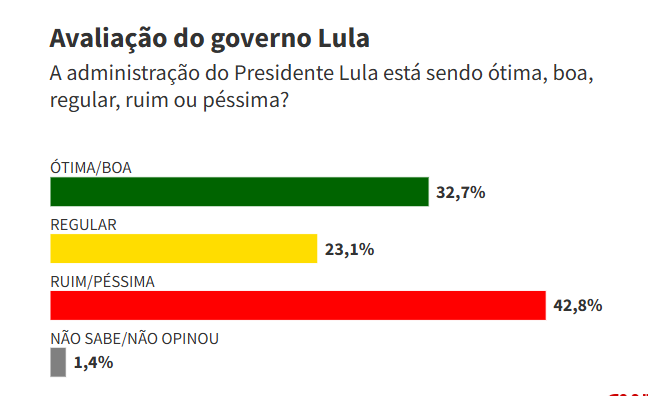 Para 32,7%, o governo é considerado ótimo ou bom; 23,1% classificam como regular; e 42,8% avaliam como ruim ou péssimo. Outros 1,4% não souberam ou não opinaram. Veja os resultados abaixo: