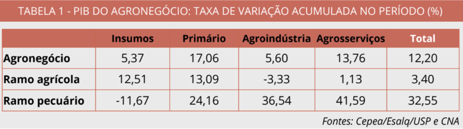 Com isso, o volume agregado do agronegócio (PIB-volume) aumentou 6,76%. Apesar dos excelentes resultados produtivos e do consequente aumento da oferta, também houve elevação dos preços reais, o que reforçou o crescimento do PIB do setor.