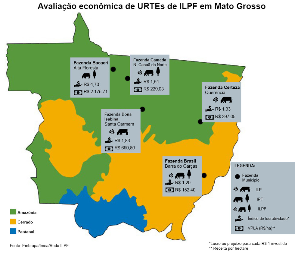 Como as URTEs são áreas de experimentação, algumas das configurações adotadas não se mostraram viáveis tecnicamente, dispensando a necessidade de uma avaliação econômica. Para driblar o aspecto experimental, a equipe do projeto está investindo agora na coleta de dados de fazendas comerciais que adotam alguma configuração de ILPF.