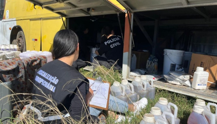No local, os agentes da Decrab encontraram uma grande quantidade de defensivos agrícolas sem comprovação de origem, evidenciando tratar-se de produtos furtados. Os defensivos estavam acondicionados em um ônibus, veículo que também estava em situação irregular, sem a devida documentação.