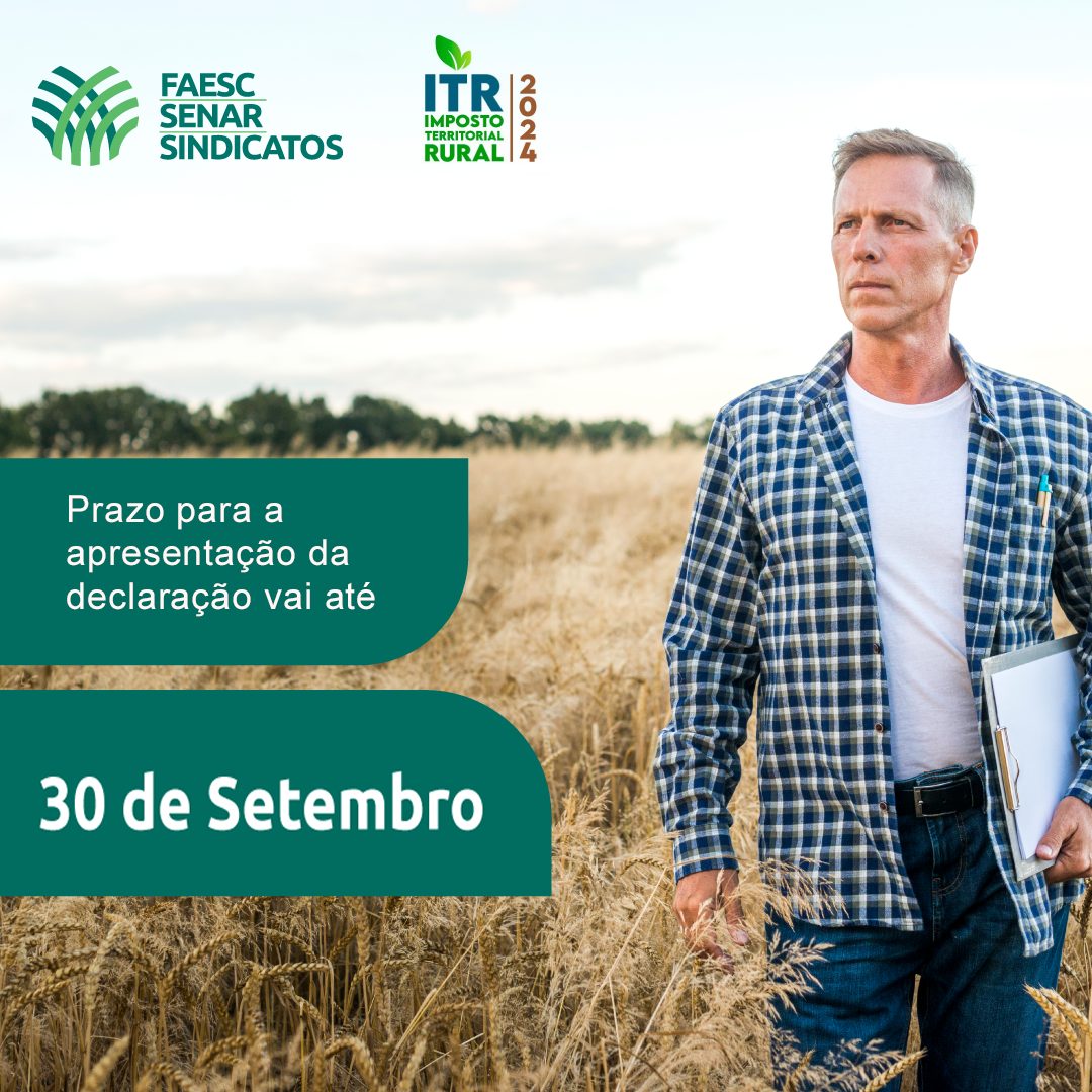 O prazo para a Declaração do Imposto sobre a Propriedade Territorial Rural (DITR), referente ao exercício de 2024, vai até 30 de setembro. A Federação da Agricultura e Pecuária do Estado de Santa Catarina (Faesc) alerta para que o produtor rural fique atento ao prazo para evitar multas na declaração do ITR.