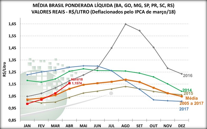 O levantamento do Centro de Estudos Avançados em Economia Aplicada (Cepea/Esalq/USP) mostra que a captação de leite no campo seguiu em queda pelo terceiro mês seguido e o preço recebido em abril registrou a terceira alta mensal consecutiva. A “Média Brasil” líquida (inclui BA, GO, MG, SP, PR, SC e RS) fechou a R$ 1,1574/litro, aumento de 7,72% (ou de 8 centavos/l) em relação ao mês anterior.