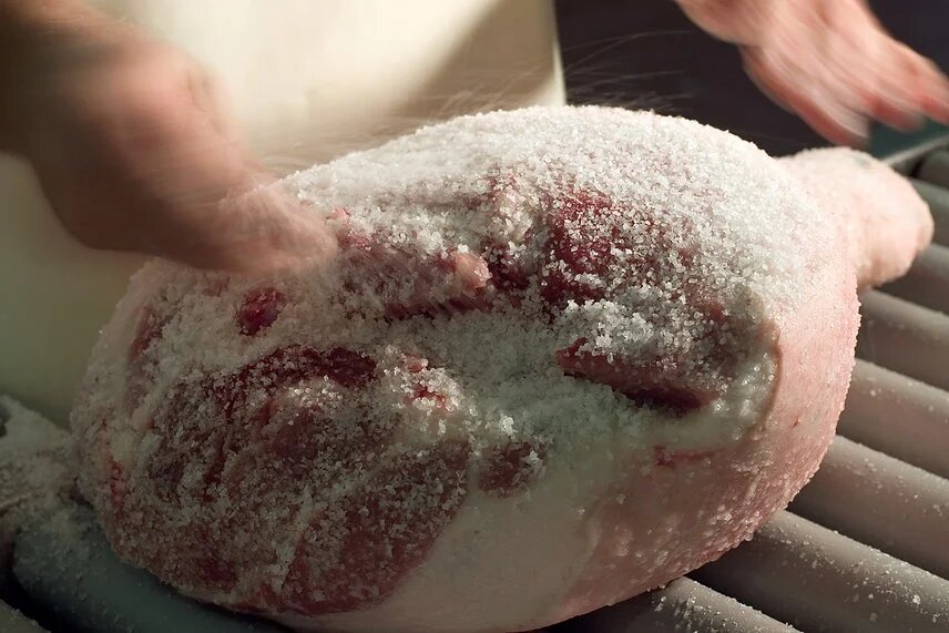 - Aplicada pelos Maestri Salatori, a carne magra recebe sal seco, enquanto a parte gordurosa recebe sal úmido. As coxas repousam por uma semana a temperaturas controladas.