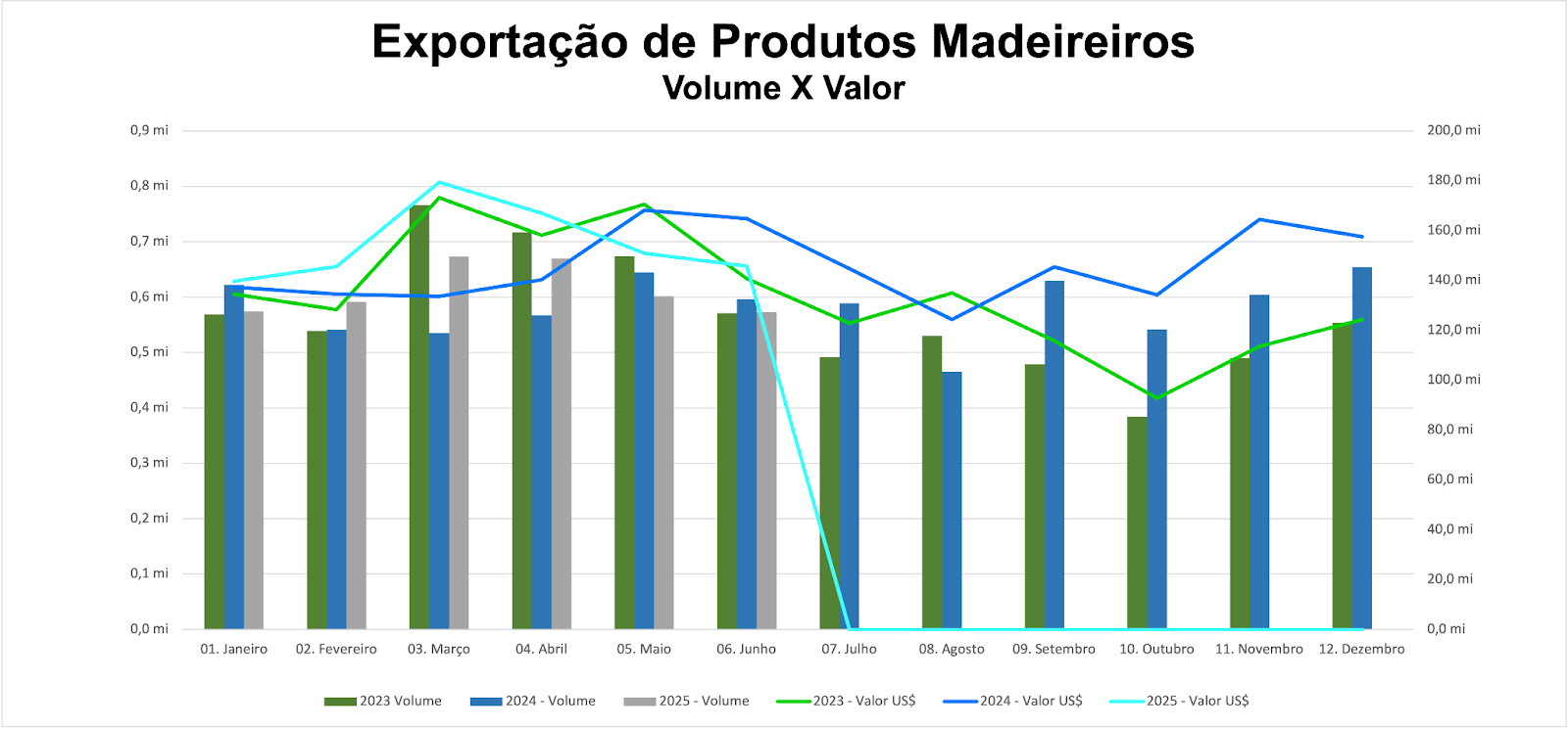 Em junho, os principais produtos exportados foram a madeira serrada de pinus, responsável por 45% do volume total, e o compensado de pinus, com 35%. Em valores, a ordem se inverte: o compensado de pinus lidera, com US$ 64,2 milhões, seguido pela madeira serrada, que somou US$ 56,8 milhões.