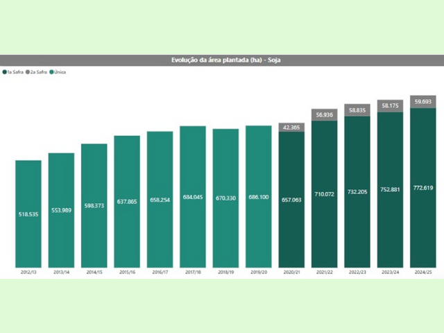 A soja vem ganhando cada vez mais espaço no agronegócio catarinense, principalmente em áreas que antes eram usadas para o plantio de milho. De acordo com dados do Observatório Agro Catarinense, ao longo dos últimos 12 anos, Santa Catarina aumentou em 275,8% a produção do grão e 60,5% a área plantada. Para a primeira safra 2024/2025 da cultura no estado, segundo o Centro de Socioeconomia e Planejamento Agrícola (Epagri/Cepa) estima, o grão teve um aumento de 2,62% na área plantada, 9,79% na produtividade média e um aumento de 12,67% na quantidade produzida.