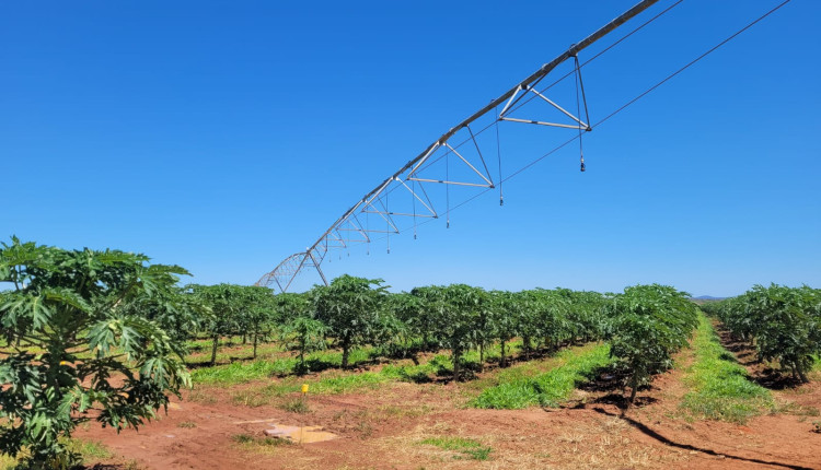 A empresa opera 32 pivôs em oito fazendas, com controle remoto por celular e integração total com sistemas de telemetria. 100% das áreas são irrigadas, sendo 2.600 ha com pivôs centrais e o restante com sistemas localizados, como microaspersão. Só de mamão são 600 hectares irrigados, voltados principalmente para os mercados de Brasília, Goiânia e Sul do país.