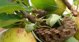 Site de notícias do interior de Santa Catarina divulga fotos de cobra em macieira e alerta para o perigo na hora da colheita das maças.
