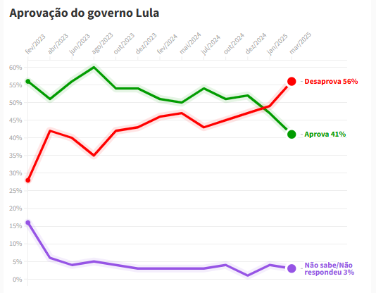 O levantamento mostra que 56% desaprovam a terceira administração do petista, enquanto 41% aprovam. Não sabem ou não responderam são 3%.