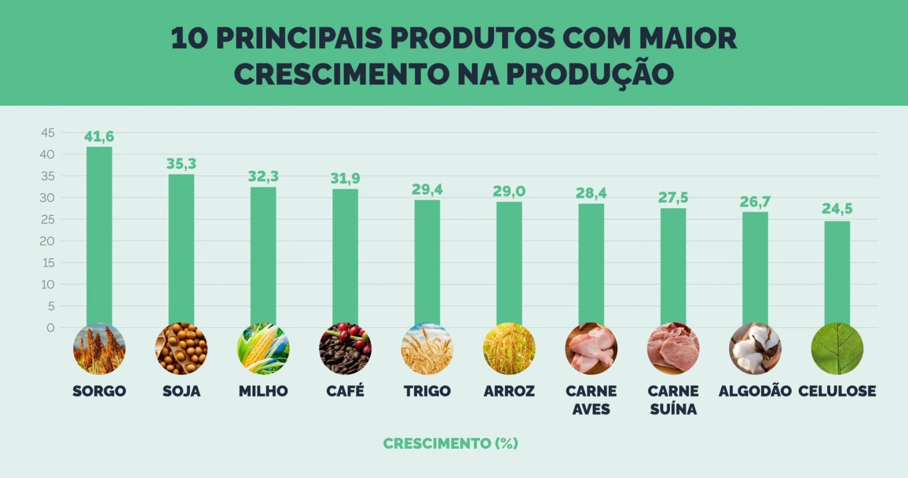 Segundo o documento, os próximos dez anos serão de importante crescimento das principais culturas do país, como soja, milho da safra de inverno, arroz, feijão, sorgo e trigo. Cultivos perenes, como café, cacau e frutas também sinalizam um crescimento sustentável no período.