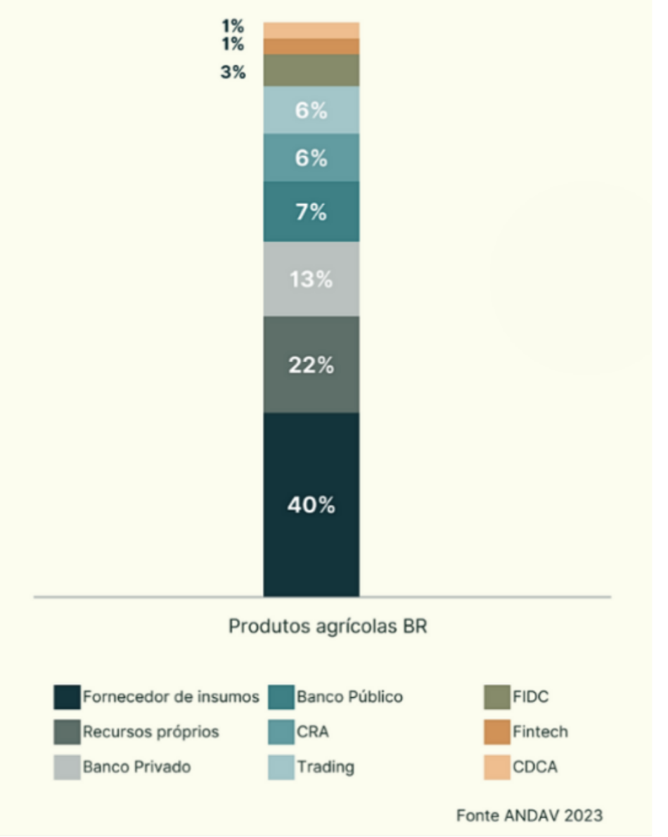 Segundo dados da Associação Nacional dos Distribuidores de Insumos Agrícolas e Veterinários (ANDAV), 40% do financiamento do agro no Brasil provém de fornecedores de insumos, enquanto meros 7% são oriundos de bancos públicos. Para suprir essa lacuna, os produtores recorrem a instrumentos de mercado como a Cédula de Produtor Rural (CPR), as Letras de Crédito do Agronegócio (LCA), os Certificados de Direitos Creditórios do Agronegócio (CDCA), os Certificados de Recebíveis do Agronegócio (CRA) e os Fundos de Investimento em Cadeias Agroindustriais (Fiagros), que sustentam o financiamento privado do setor.