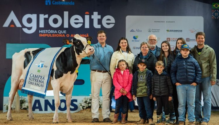 O encerramento dos julgamentos de pista do Agroleite 2025, na noite de sexta-feira, 08 de agosto, coroou a excelência genética e o trabalho dedicado de produtores de diferentes regiões. A Campeã Suprema das Raças foi a vaca da raça holandesa Preta e Branca, FINI BLIZZARD HERINGA 21244, de Reynold Groenwold, de Castro (PR), cooperado da Castrolanda. A vaca garantiu seu nome na Calçada da Fama do Castrolanda Expo Center, eternizando seu feito na história da exposição. O título de Suprema das Raças é disputado pela raça holandesa nas duas variedades, Preta e Branca e Vermelha e Branca, e Jersey.