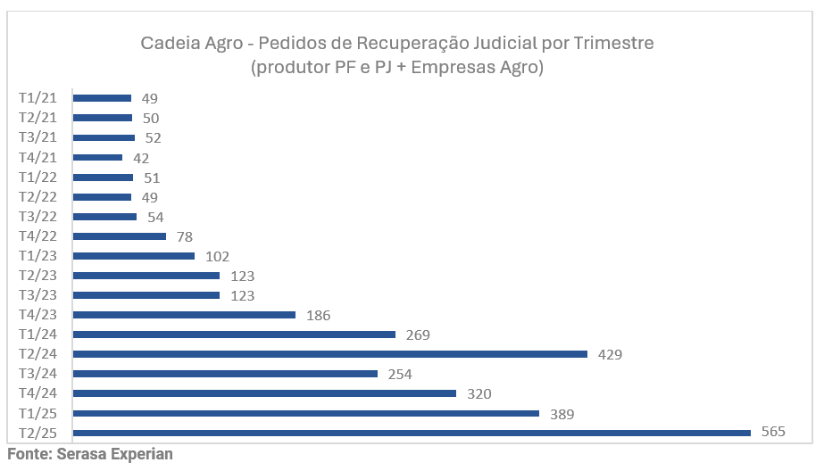 O estudo identificou 102 pedidos de recuperação judicial entre empresas do setor agro, o maior volume recente, superando as 94 solicitações do mesmo trimestre de 2024.