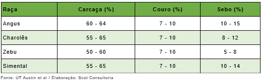 A Scot Consultoria publicou em 2019 um artigo sobre o rendimento de carcaça bovina e os cortes cárneos considerando gado brasileiro. Esse rendimento de carcaça varia de acordo com a raça e consequentemente o de coprodutos como couro e sebo bovino também.