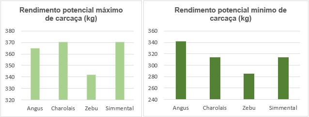 Máximo e mínimo potenciais de rendimento de carcaça, por raça bovina, em quilogramas, considerando um bovino com peso vivo de 570 kg.