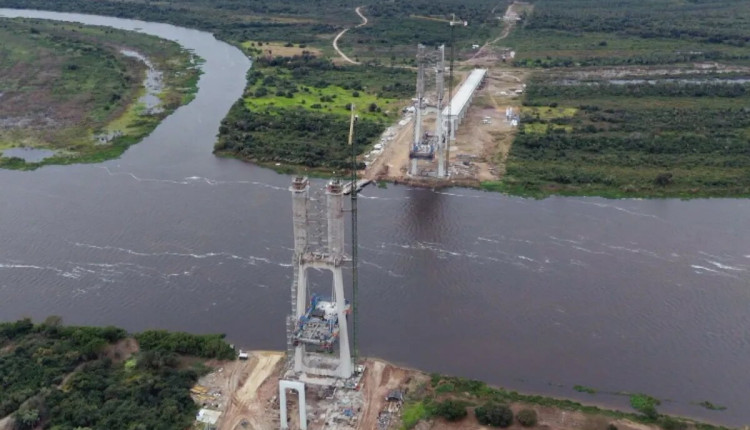 Com 75% da obra já executada, a estrutura impressiona por suas dimensões: são 1.294 metros de extensão e 21 metros de largura, incluindo viadutos de acesso e um trecho estaiado com torres de 125 metros de altura. A ponte será a terceira ligação entre os dois países.