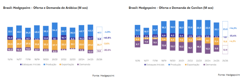 A menor oferta pode impactar as exportações, que devem cair em comparação com os níveis recordes de 24/25. Os estoques também podem começar o novo ciclo baixos, limitando novas vendas. Segundo Laleska, no consumo interno, com preços elevados do arábica e conilon mais barato, a expectativa é de que os torrefadores possam aumentar a presença de conilon nos blends.