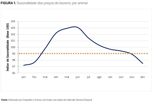Quando analisado o preço médio por quilo de bezerro vivo, o índice de sazonalidade tem uma amplitude (diferença entre os mínimos e máximos) de 4,43%, também já descontando o efeito da inflação.