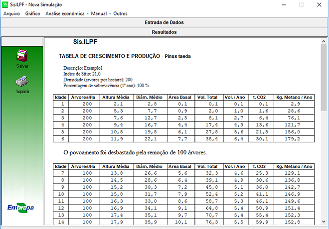 Os softwares geram tabelas e gráficos de prognose do crescimento e da produção das árvores nos sistemas de ILPF, em função de dados do plantio. Segundo Oliveira, além de indicar a quantidade de madeira que será produzida, em árvores de qualquer idade, e possibilitar simular desbastes e testar qualquer regime de manejo que se deseja aplicar, o SisILPF calcula o carbono capturado pelas árvores e o equivalente em CO2 e metano, e emite gráficos com estimativas do número de animais que podem ter a emissão de metano compensada pelas árvores da ILPF. “Isso é um diferencial importante dos sistemas de integração com florestas,” afirma o especialista.
